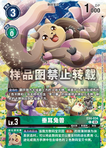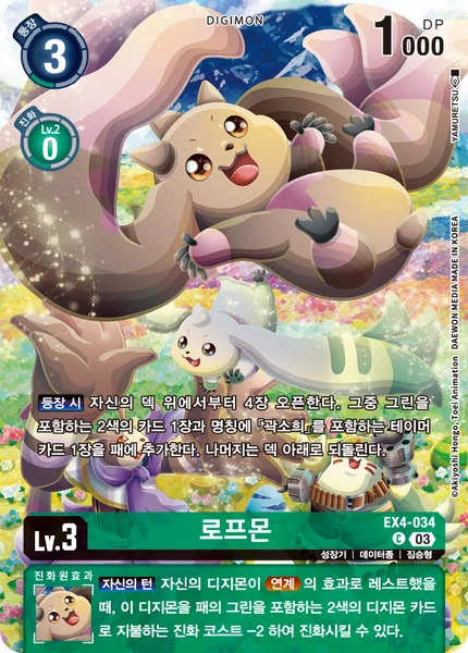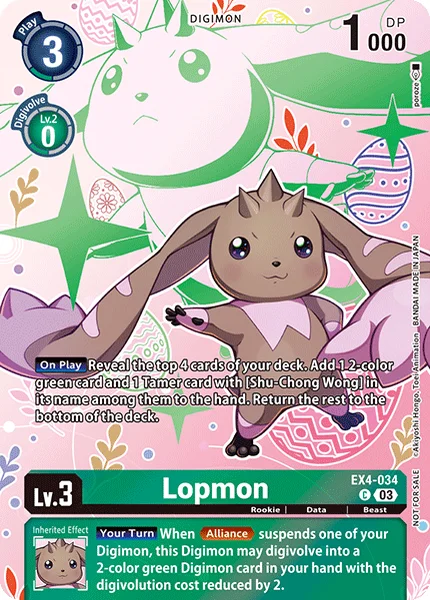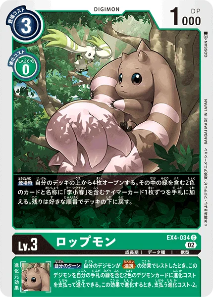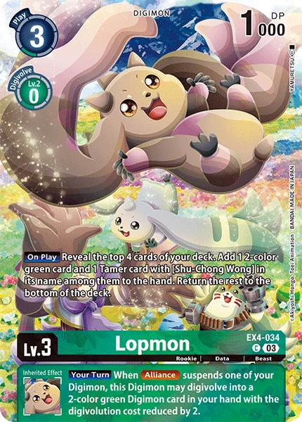 Your Turn When Alliance suspends one of your Digimon, this Digimon may digivolve into a 2-color green Digimon card in your hand for the cost. When this Digimon would digivolve by this effect, reduce the cost by 2.