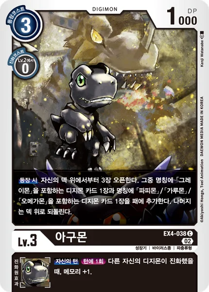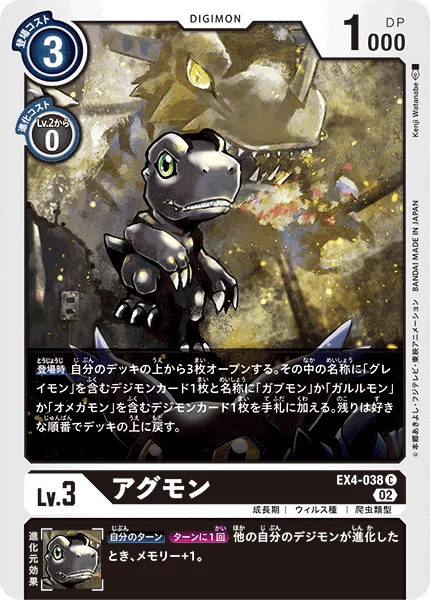 On Play Reveal the top 3 cards of your deck. Add 1 Digimon card with [Greymon] in its name and 1 Digimon card with [Gabumon], [Garurumon], or [Omnimon] in its name among them to your hand. Place the rest on top of your deck in any order.