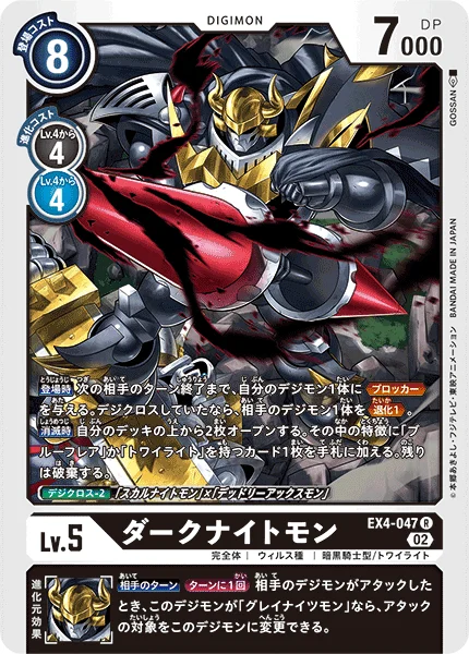 Opponent's TurnOnce Per Turn When an opponent's Digimon attacks, if this Digimon is [GreyKnightsmon], you may switch the target of attack to this Digimon.