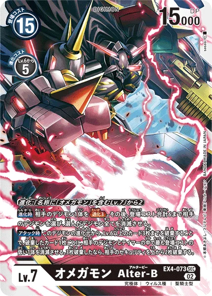 When Attacking By trashing up to 3 level 6 or higher cards in this Digimon's digivolution cards, among your opponent's Digimon and Tamers, delete 1 with the lowest play cost for each card trashed. If you trashed 3 cards, trash the top 2 cards of your opponent's security stack.
