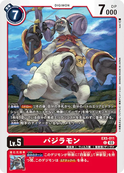 On Play Draw 1. Then, you may play 1 [Deva] trait Digimon card without the same name as the cards in your battle area or trash from your hand to an empty space in your breeding area without paying the cost.