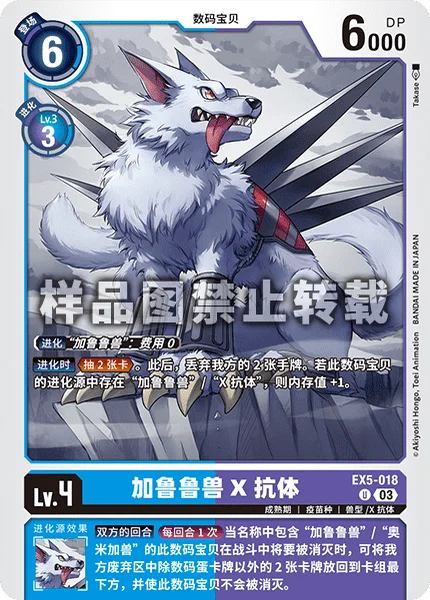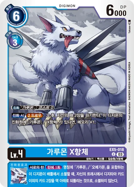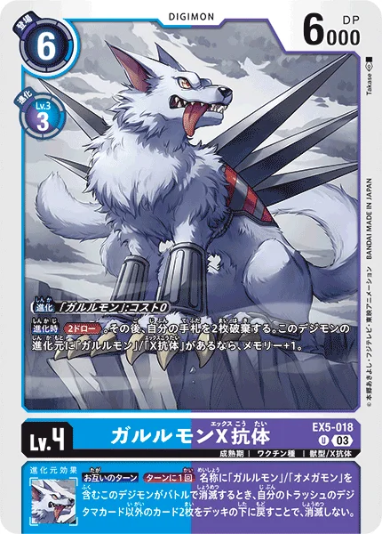 When Digivolving Draw 2. Then, trash 2 cards in your hand. If [Garurumon] or [X Antibody] is in this Digimon's digivolution cards, gain 1 memory.