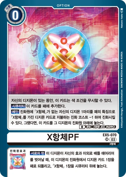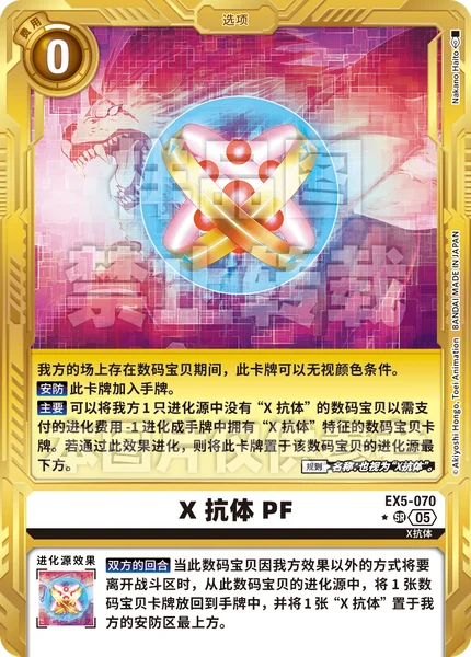 Main 1 of your Digimon without [X Antibody] in its digivolution cards may digivolve into a Digimon card with the [X Antibody] trait in your hand with the digivolution cost reduced by 1. If it did, place this card as its bottom digivolution card. Rule Name: Also treated as [X Antibody].