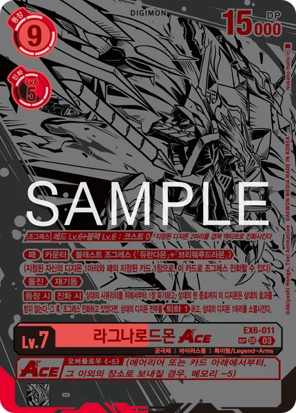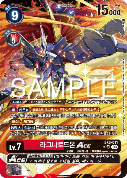 DNA DigivolutionRedLv.6 +BlackLv.6: Cost 0 Digivolve unsuspended with the 2 specified Digimon stacked on top of each other.