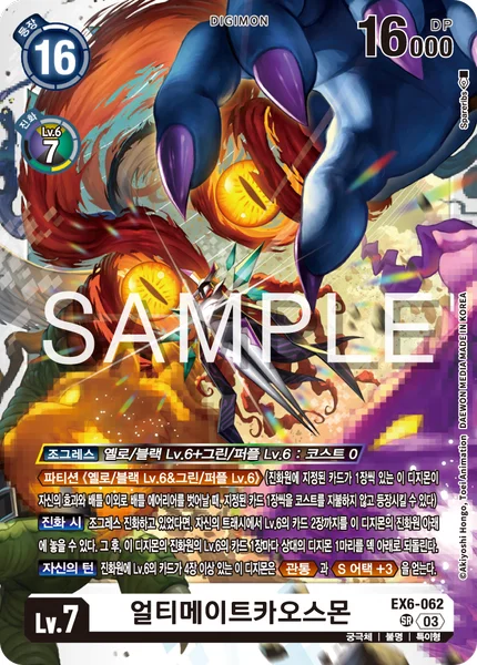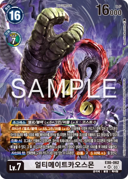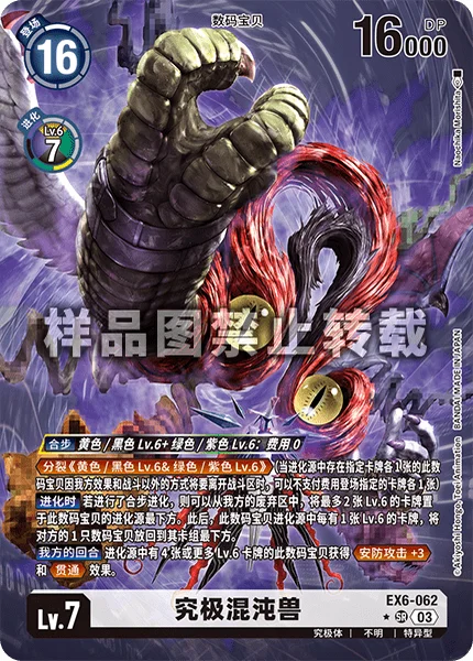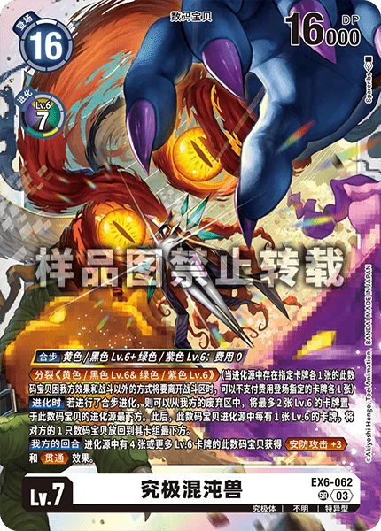 This card's DNA digivolution can only be performed using a combination of 1 level 6 yellow or black Digimon and 1 level 6 green or purple Digimon.
