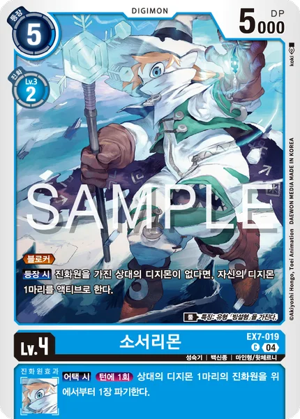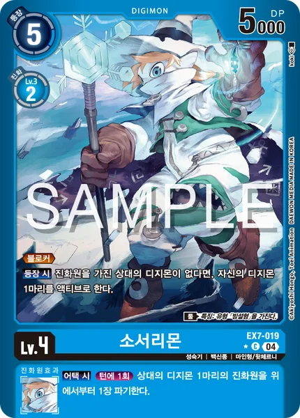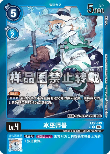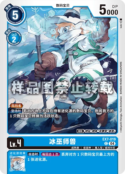 On Play If your opponent has no Digimon with digivolution cards, 1 of your Digimon unsuspends. Rule Trait: Has [Ice-Snow] Type.