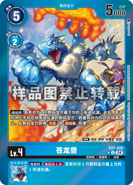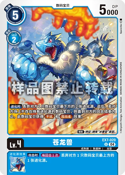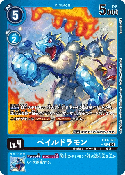 When Digivolving Trash the bottom 2 digivolution cards of 1 of your opponent's Digimon. Then, if your opponent has no Digimon with digivolution cards, this Digimon gains Jamming and Blocker until the end of your opponent's turn. Rule Trait: Has [Ice-Snow] Type.