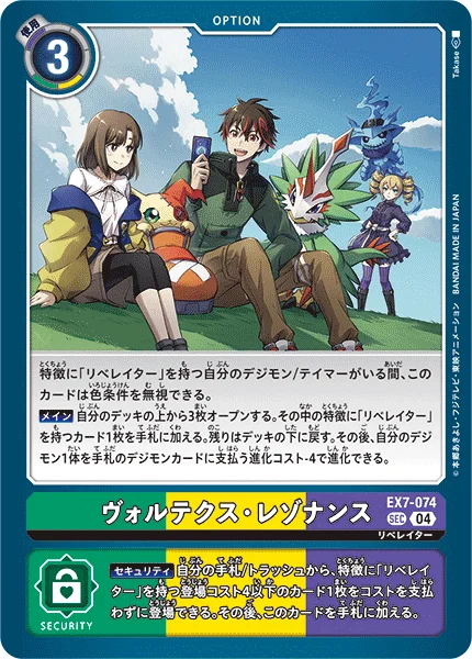 Main Reveal the top 3 cards of your deck. Add 1 card with the [LIBERATOR] trait among them to the hand. Return the rest to the bottom of the deck. Then, 1 of your Digimon may digivolve into a Digimon card in the hand with the digivolution cost reduced by 4.