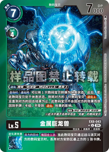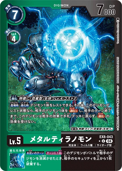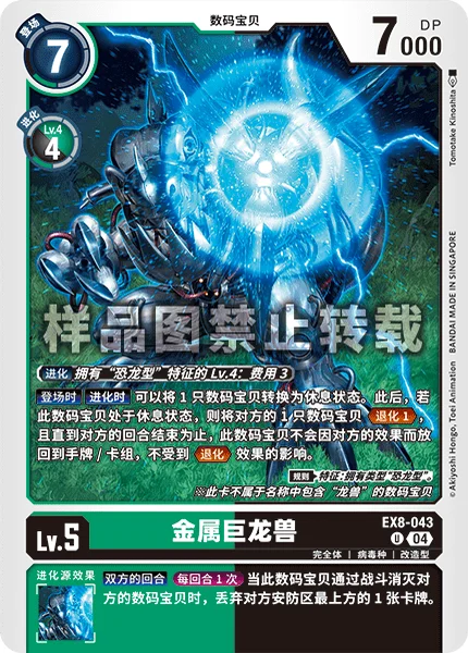 On Play When Digivolving You may suspend 1 Digimon. Then, if this Digimon is suspended, De-Digivolve 1 1 of your opponent's Digimon and, until the end of your opponent's turn, their effects can't return this Digimon to hands or decks or affect it with De-Digivolve effects. Rule Trait: Has [Dinosaur] Type.