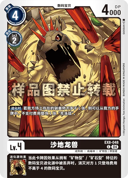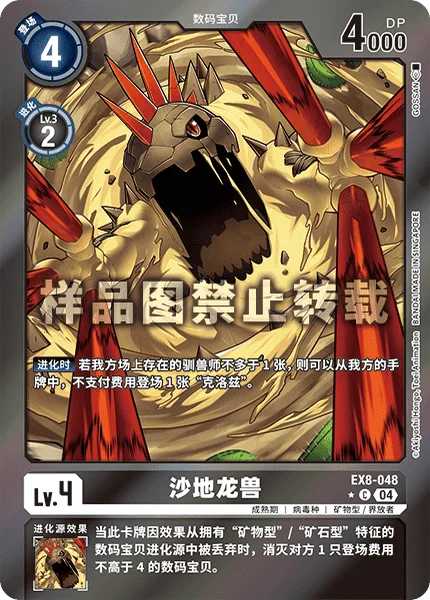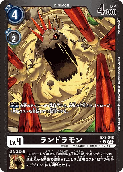 When effects trash this card from a [Mineral] or [Rock] trait Digimon's digivolution cards, delete 1 of your opponent's Digimon with a play cost of 4 or less.