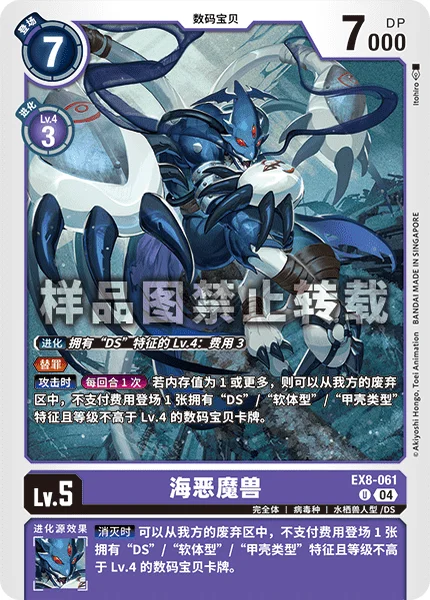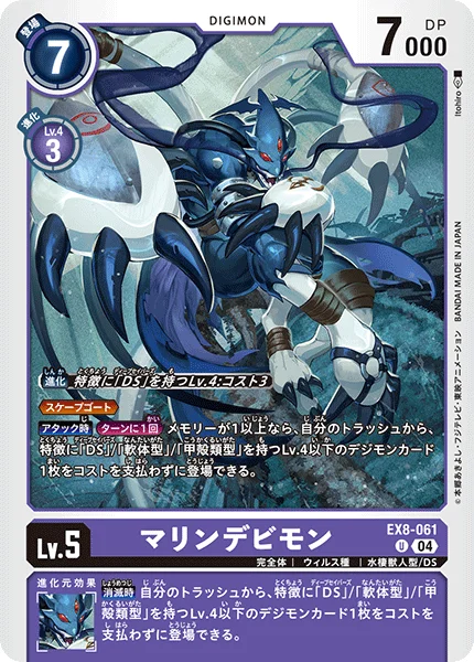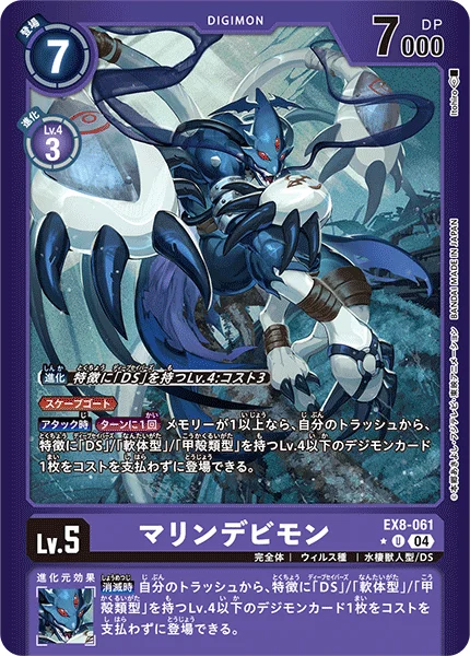 It can play 1 level 4 or lower Digimon card with the [DS] trait, 1 level 4 or lower Digimon card with the [Mollusk] trait, or 1 level 4 or lower Digimon card with the [Crustacean] trait.