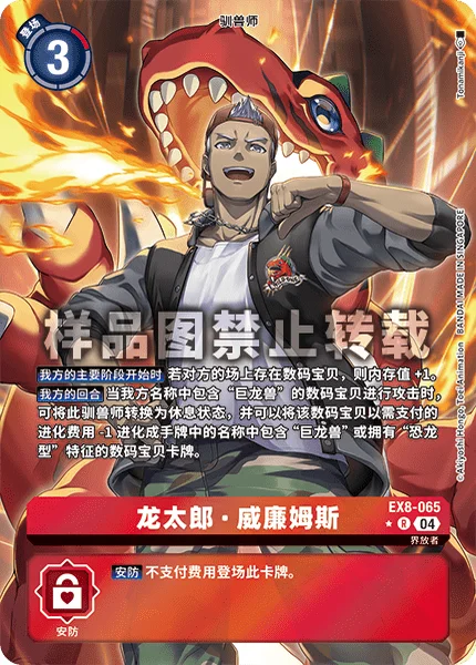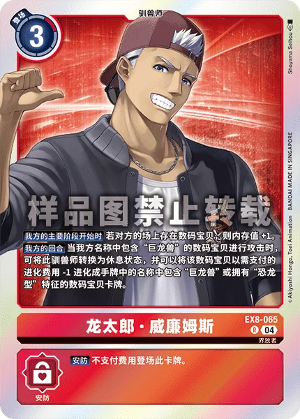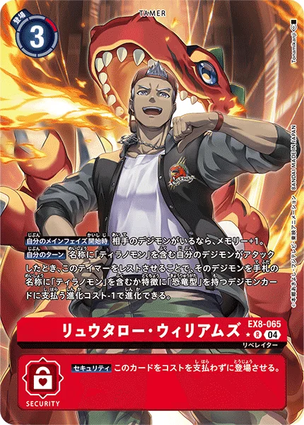 Your Turn When one of your Digimon with [Tyrannomon] in its name attacks, by suspending this Tamer, that Digimon may digivolve into a Digimon card with [Tyrannomon] in its name or the [Dinosaur] trait in the hand with the digivolution cost reduced by 1.