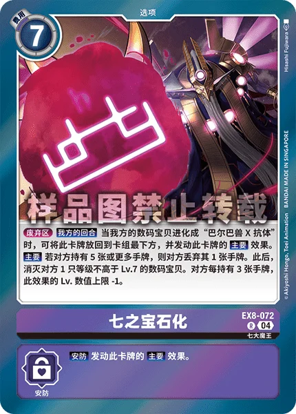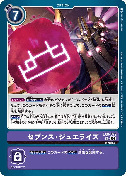 Main If your opponent has 5 or more cards in their hand, they trash 1 card in their hand. Then, delete 1 of your opponent's level 7 or lower Digimon. For every 3 cards in their hand, remove 1 from this effect's level maximum.