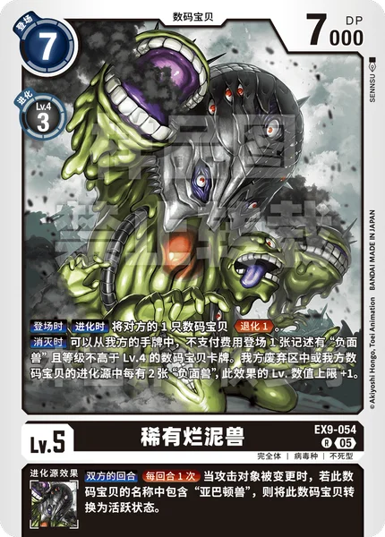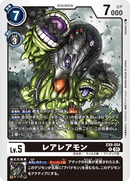 On Deletion You may play 1 level 4 or lower Digimon card with [Negamon] in its text from your hand without paying the cost. For every 2 [Negamon] in your trash or your Digimon's digivolution cards, add 1 to this effect's level maximum.
