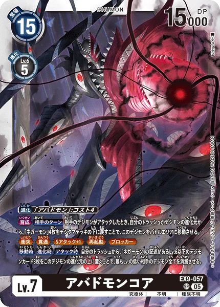When Moving When Digivolving When Attacking By placing 3 level 6 or lower Digimon cards with [Negamon] in their texts from your trash as this Digimon's top digivolution cards, delete all of your opponent's lowest level Digimon.