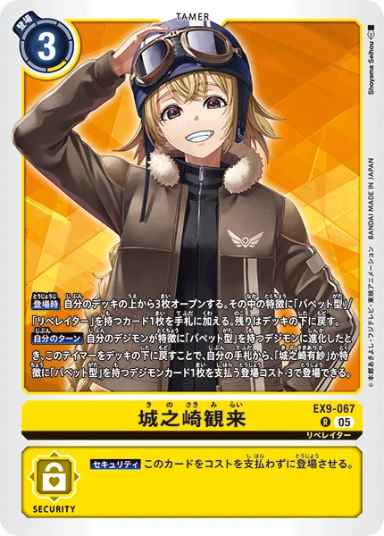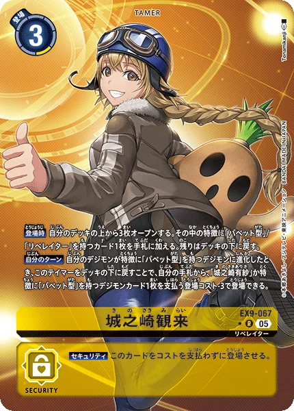 Your Turn When any of your Digimon digivolve into a [Puppet] trait Digimon, by returning this Tamer to the bottom of the deck, you may play 1 [Arisa Kinosaki] or 1 [Puppet] trait Digimon card from your hand with the play cost reduced by 3.