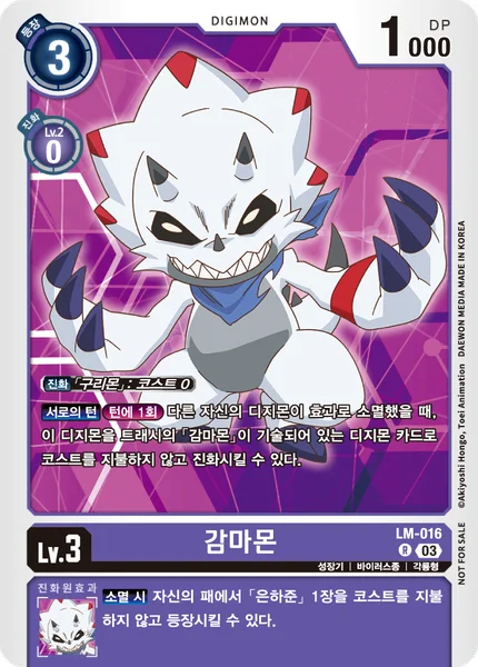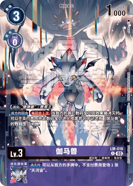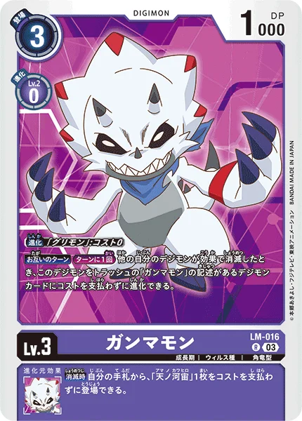 All Turns Once Per Turn When an effect deletes one of your other Digimon, this Digimon may digivolve into a Digimon card with [Gammamon] in its text in your trash without paying the cost.