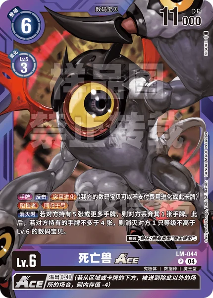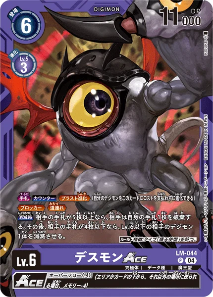 On Deletion If your opponent has 5 or more cards in their hand, they trash 1 card in their hand. Then, if they have 4 or fewer, delete 1 of their level 6 or lower Digimon. Rule Trait: Has [Fallen Angel] Type.