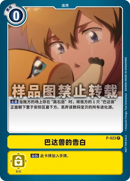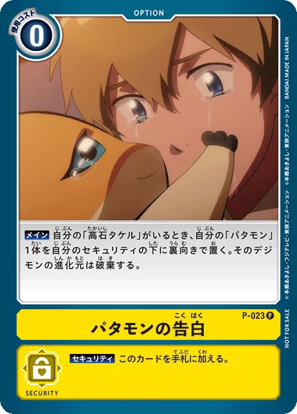 Main If you have [T.K. Takaishi] in play, place 1 of your [Patamon] at the bottom of your security stack face down. Trash that Digimon's digivolution cards.