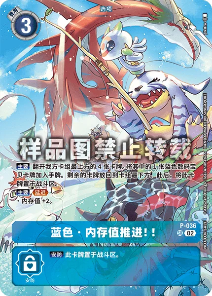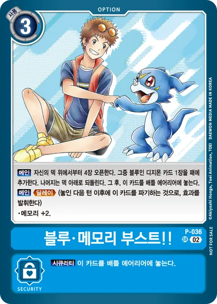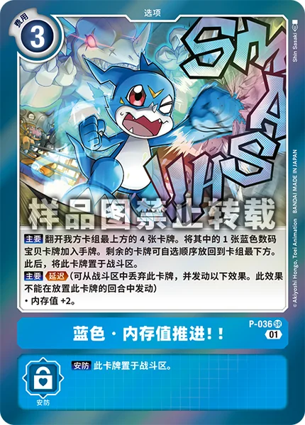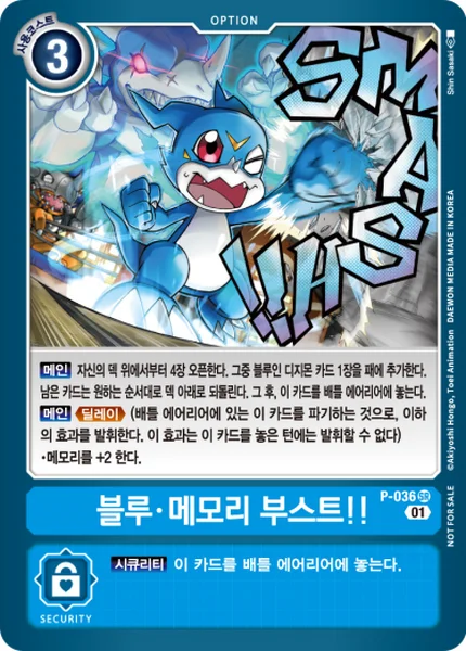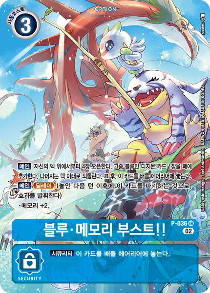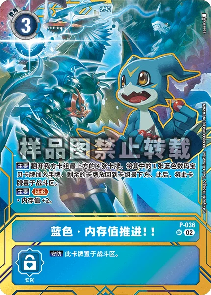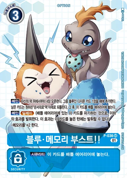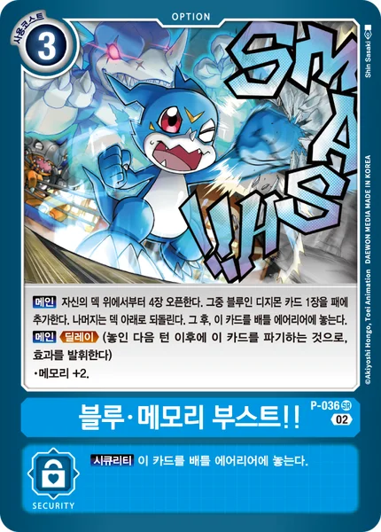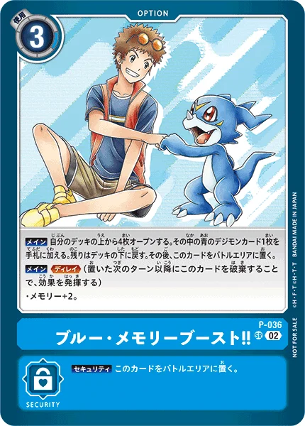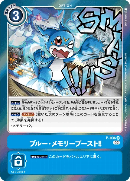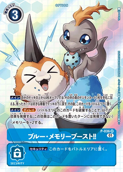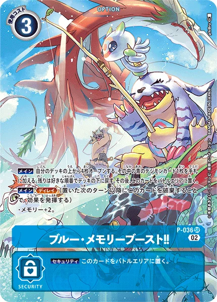 Main Reveal the top 4 cards of your deck. Add 1 blue Digimon card among them to your hand. Place the remaining cards at the bottom of your deck in any order. Then, place this card in your battle area. Main Delay (Trash this card in your battle area to activate the effect below. You can't activate this effect the turn this card enters play.) ・Gain 2 memory.