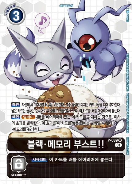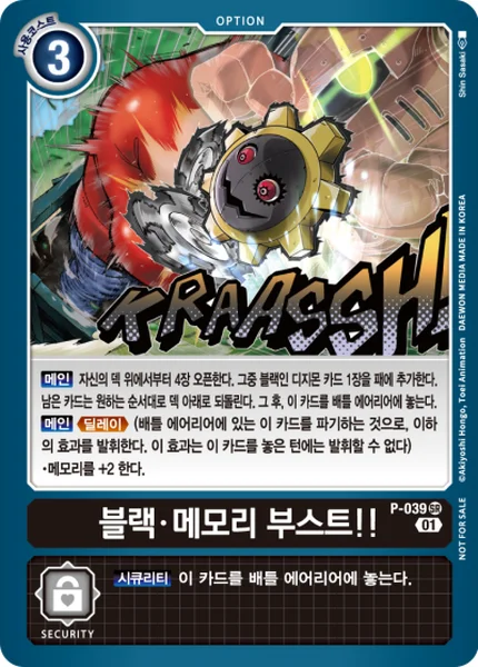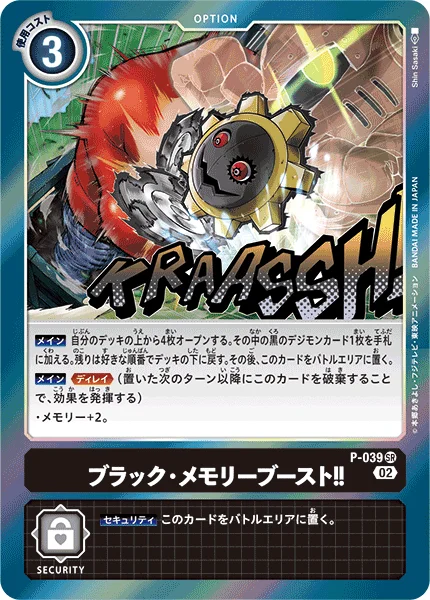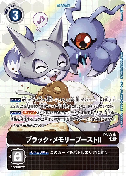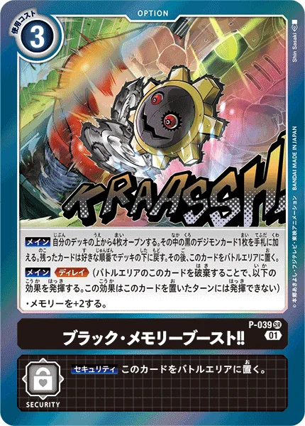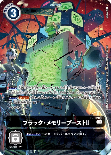 Main Reveal the top 4 cards of your deck. Add 1 black Digimon card among them to your hand. Place the remaining cards at the bottom of your deck in any order. Then, place this card in your battle area. Main Delay (Trash this card in your battle area to activate the effect below. You can't activate this effect the turn this card enters play.) ・Gain 2 memory.