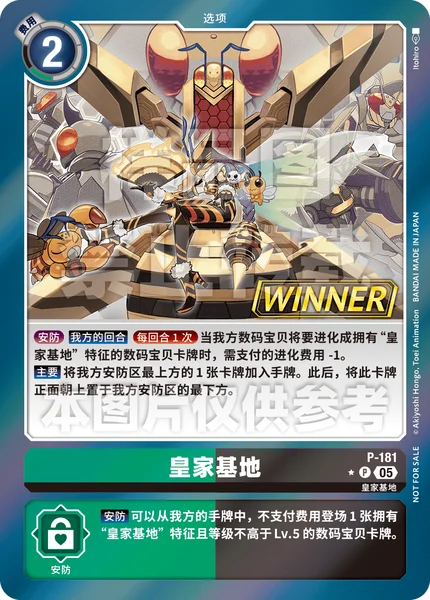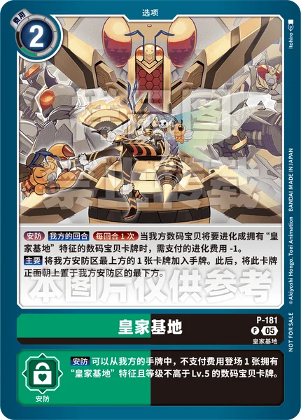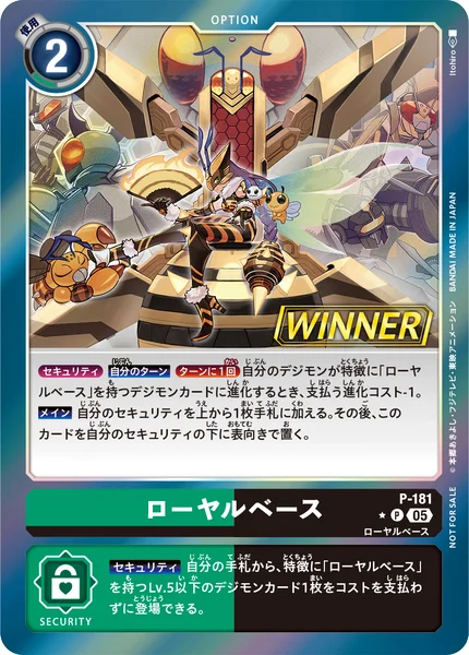 Security Your Turn Once Per Turn When any of your Digimon would digivolve into a Digimon card with the [Royal Base] trait, reduce the digivolution cost by 1.