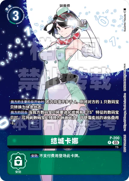 Your Turn When any of your Digimon would digivolve into a Digimon card with the [TS] trait, by suspending this Tamer, reduce the digivolution cost by 1.