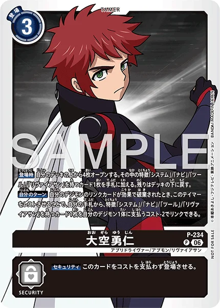 Your Turn When effects trash any of your Digimon's link cards, by suspending this Tamer, you may link 1 [System], [Navi], [Tool] or [Leviathan] trait card from your hand to 1 of your Digimon with the cost reduced by 2.