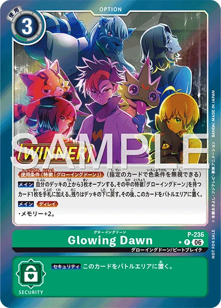 Main Reveal the top 3 cards of your deck. Add 1 card with the [Glowing Dawn] trait among them to the hand. Return the rest to the bottom of the deck. Then, place this card in the battle area.