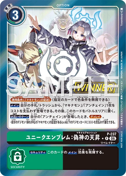 All Turns When any of your [Unchained]s are played, Delay. ・1 of your Digimon may digivolve into a level 6 or lower Digimon card with [Maquinamon] in its text in the hand without paying the cost.