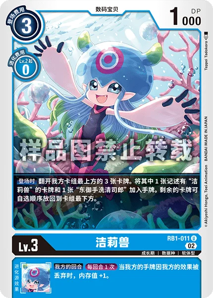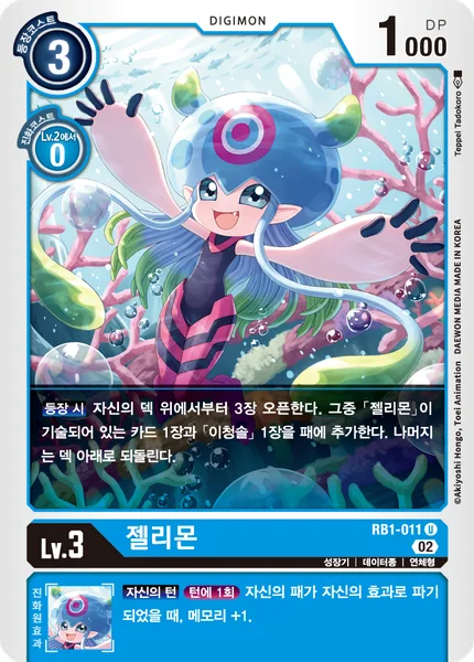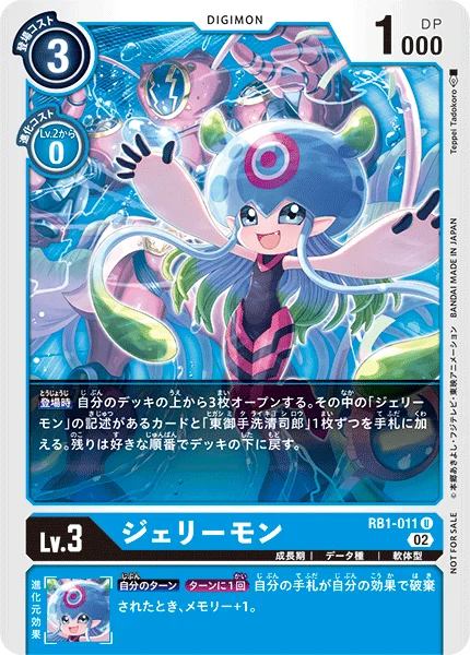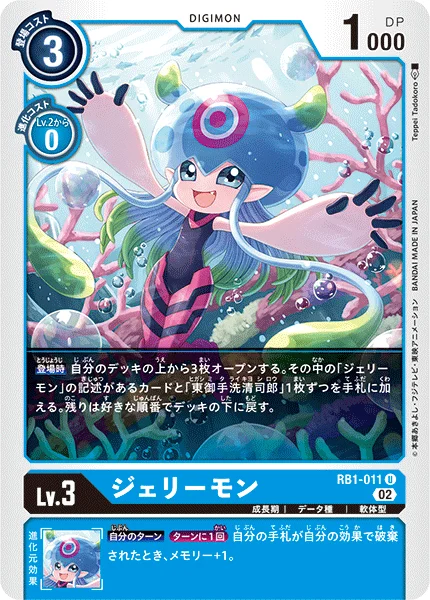 On Play Reveal the top 3 cards of your deck. Add 1 card with [Jellymon] in its text and 1 [Kiyoshiro Higashimitarai] among them to the hand. Place the rest at the bottom of the deck in any order.