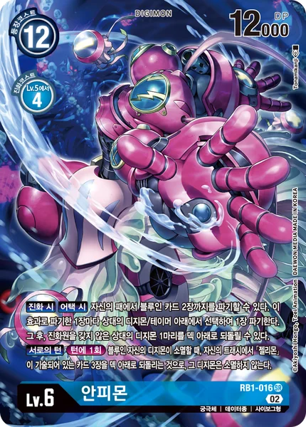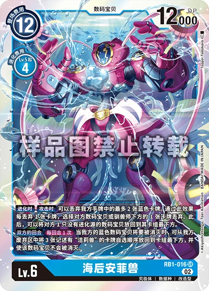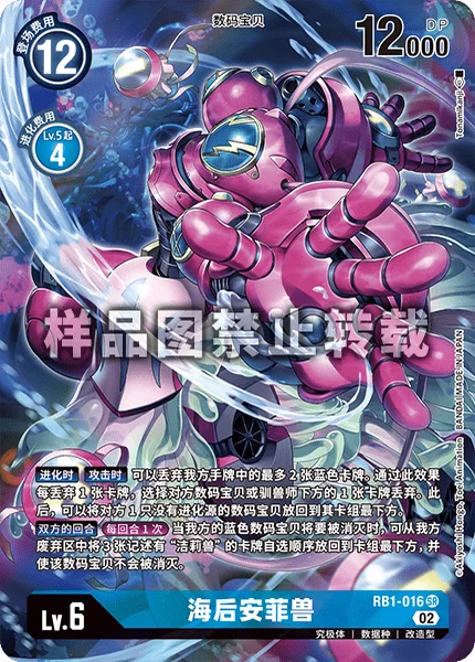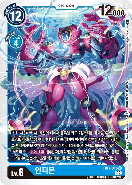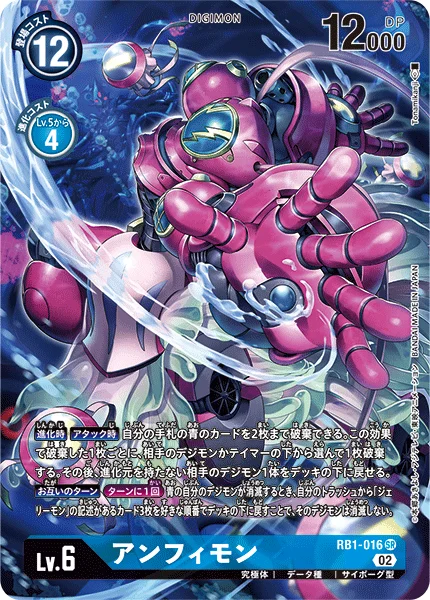 All TurnsOnce Per Turn When one of your blue Digimon would be deleted, by returning 3 cards with [Jellymon] in their texts from your trash to the bottom of the deck in any order, prevent its deletion.