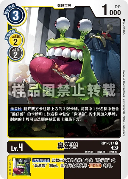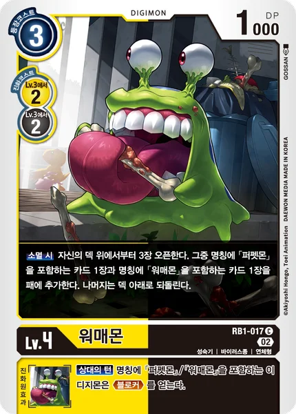 On Deletion Reveal the top 3 cards of your deck. Add 1 card with [Monzaemon] in its name and 1 card with [Numemon] in its name among them to the hand. Place the rest at the bottom of the deck in any order.