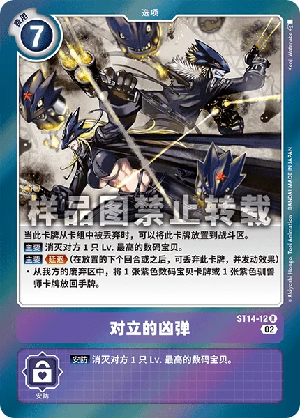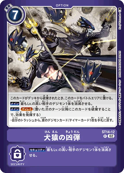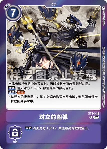 When this card is trashed from your deck, you may place it in the battle area. Main Delete 1 of your opponent's Digimon with the highest level. Main Delay (After this card is placed, by trashing it the next turn or later, activate the effect below.) ・Return 1 purple Digimon card or Tamer card from your trash to your hand.