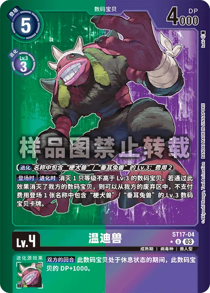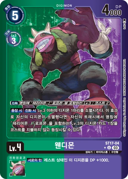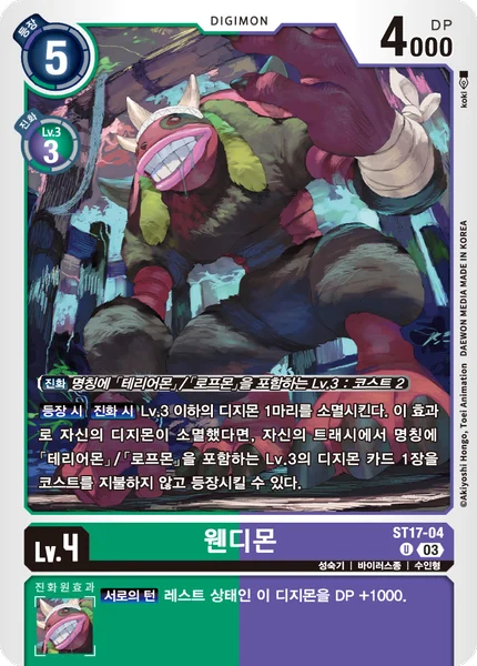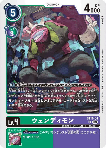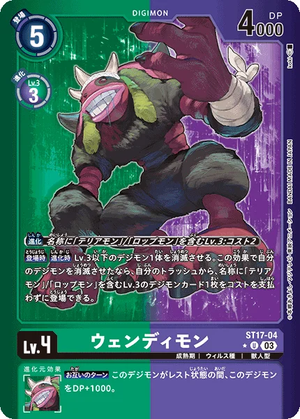 On Play When Digivolving Delete 1 level 3 or lower Digimon. If this effect deleted one of your Digimon, you may play 1 level 3 Digimon card with [Terriermon] or [Lopmon] in its name from your trash without paying the cost.