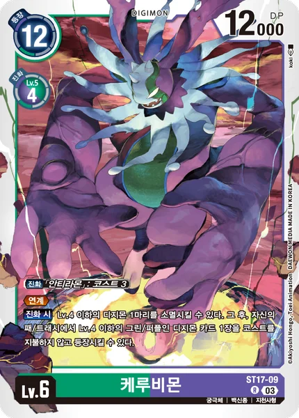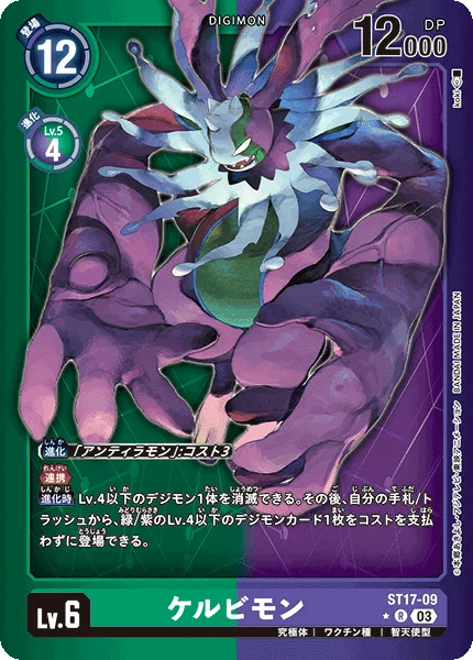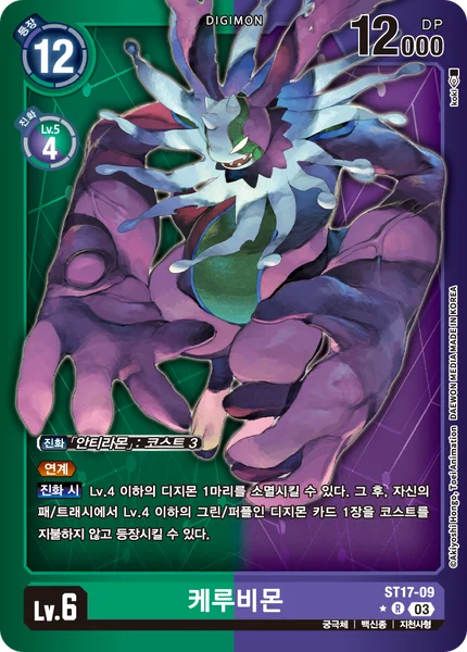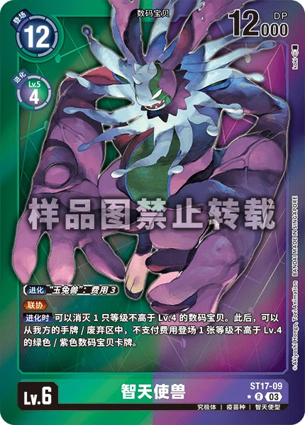 When Digivolving You may delete 1 level 4 or lower Digimon. Then, you may play 1 level 4 or lower green or purple Digimon card from your hand or trash without paying the cost.