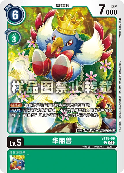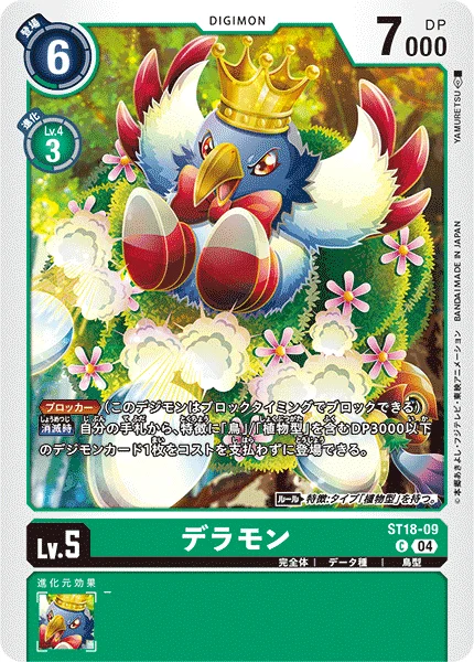 On Deletion You may play 1 Digimon card with [Avian], [Bird], [Vegetation] or [Plant] in any of its traits and 3000 DP or less from your hand without paying the cost. Rule Trait: Has [Vegetation] Type.
