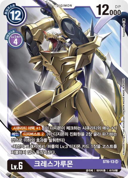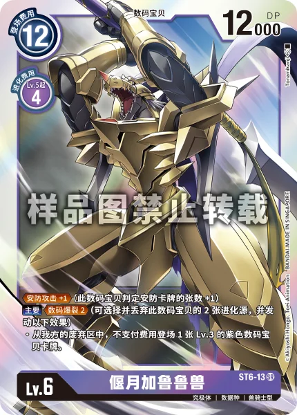 Security Attack +1 (This Digimon checks 1 additional security card.)Main Digi-Burst 2 (Trash 2 of this Digimon's Digivolution cards to activate the effect below.)・Play 1 purple level 3 Digimon card from your trash without paying its memory cost.