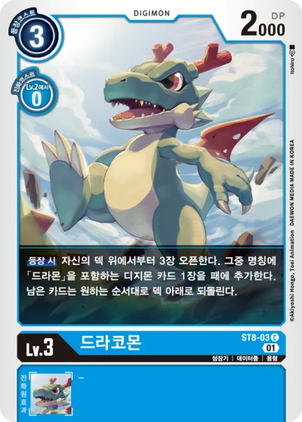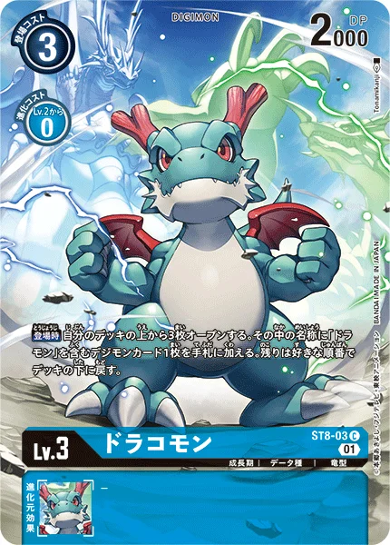 On Play Reveal the top 3 cards of your deck. Add 1 Digimon card with [Dramon] in its name among them to your hand. Place the remaining cards at the bottom of your deck in any order.