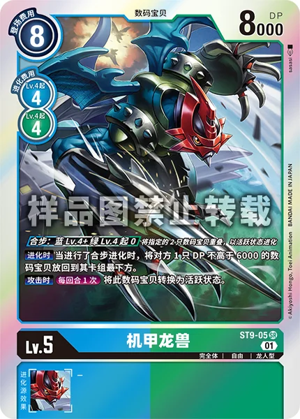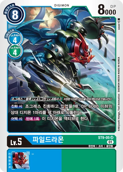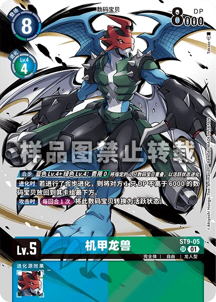 DNA Digivolution 0 fromBlueLv.4 +GreenLv.4 Digivolve unsuspended with the 2 specified Digimon stacked on top of each other.When Digivolving When DNA digivolving, return 1 of your opponent's Digimon with 6000 DP or less to the bottom of its owner's deck.When AttackingOnce Per Turn Unsuspend this Digimon.