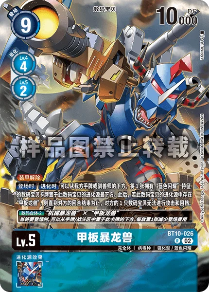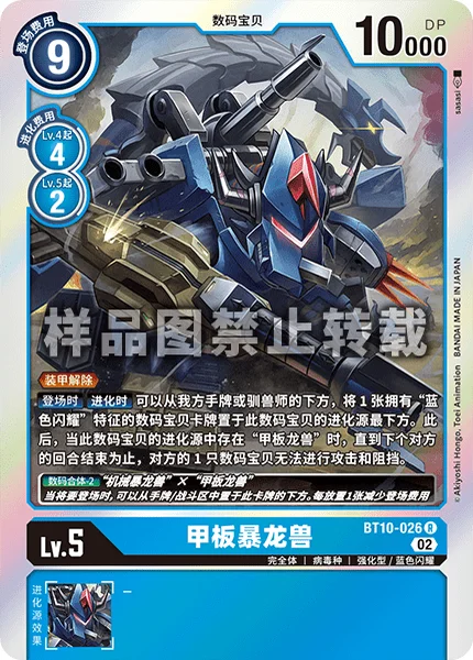 登場時進化時自分の手札かテイマーの下から、特徴に「ブルーフレア」を持つデジモンカード1枚をこのデジモンの進化元の下に置ける。その後、このデジモンの進化元に「デッカードラモン」があるなら、次の相手のターン終了まで、相手のデジモン1体はアタックとブロックができない。
