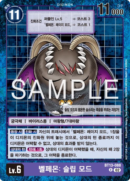 登場時進化時自分のトラッシュから、「ベルフェモン:レイジモード」1枚をこのデジモンの進化元の上に置くことで、次の相手のターン終了まで、このデジモンはアタックできず、相手の効果を受けない。