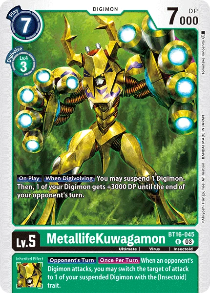 相手のターンターンに1回相手のデジモンがアタックしたとき、アタックの対象を特徴に「昆虫型」を持つレスト状態の自分のデジモン1体に変更できる。