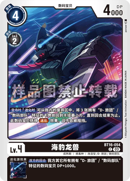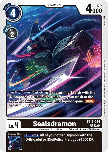 登場時進化時自分のトラッシュから、特徴に「D-ブリガード」/「デジ対」を持つカード3枚をデッキの上に戻すことで、ターン終了まで、このデジモンは速攻を得て、ブロックされない。