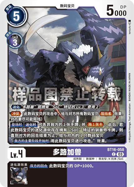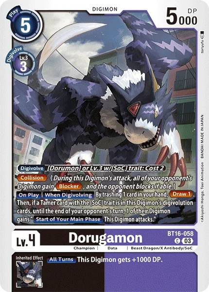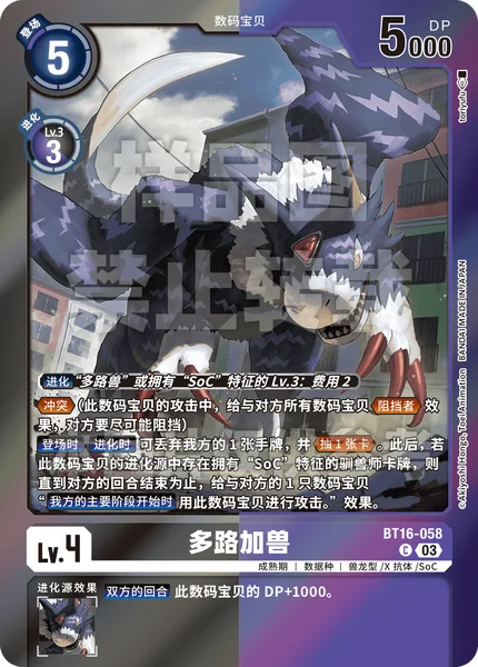登場時進化時自分の手札を1枚破棄することで、1ドロー。その後、このデジモンの進化元に特徴に「SoC」を持つテイマーカードがあるなら、相手のターン終了まで、相手のデジモン1体に「自分のメインフェイズ開始時このデジモンでアタックする。」の効果を与える。