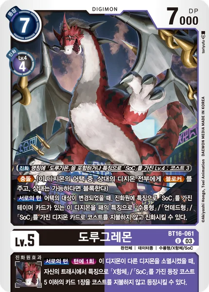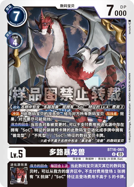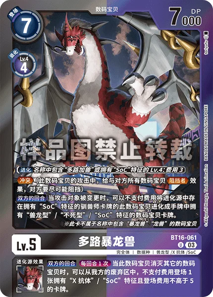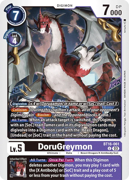 お互いのターンアタックの対象が変更されたとき、進化元に特徴に「SoC」を持つテイマーカードがあるこのデジモンを手札の特徴に「獣竜型」/「アンデッド型」/「SoC」を持つデジモンカードにコストを支払わずに進化できる。