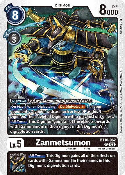 お互いのターンこのデジモンは、このデジモンの進化元にある名称に「ガンマモン」を含むカードの効果全てを得る。