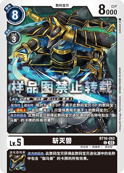登場時進化時このデジモンのDP以下の相手のデジモン1体を退化1。その後、登場コスト3以下のデジモン1体を消滅させる。