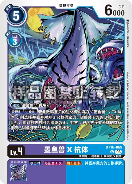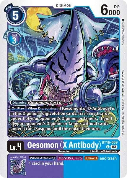 登場時進化時このデジモンの進化元に「ゲソモン」/「X抗体」があるなら、相手のデジモン/テイマー1体の下から選んで3枚破棄する。その後、相手のターン終了まで、下にカードが無い相手のデジモン/テイマー1体はレストできない。