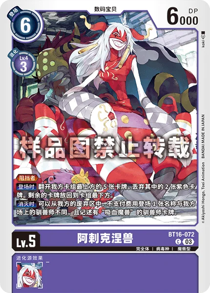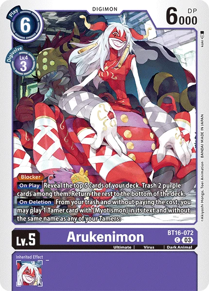 登場時自分のデッキの上から5枚オープンする。その中の紫のカード2枚を破棄する。残りはデッキの下に戻す。